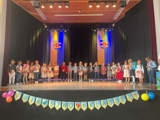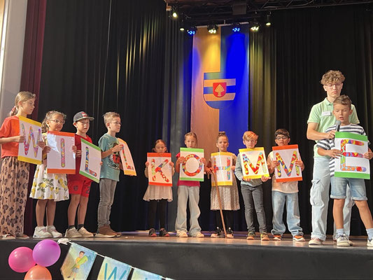 „Willkommen in der Schule“ – diese Botschaft entstand durch all die einzelnen Buchstaben, die die Zweitklasskinder in der Hand hielten und ihre Sprüche vortrugen. Das gemeinsam gesungene Lied „Willkommen in der Schule“ vermittelte doch ganz klar: Nur eine Sache fehlt – das bist du! Wie stolz sind wir auf unsere Zweitklasskinder, die noch vor einem Jahr selbst Erstklässler und Erstklässerinnen waren und nun auf der Bühne die „Neuen“ begrüßten.
